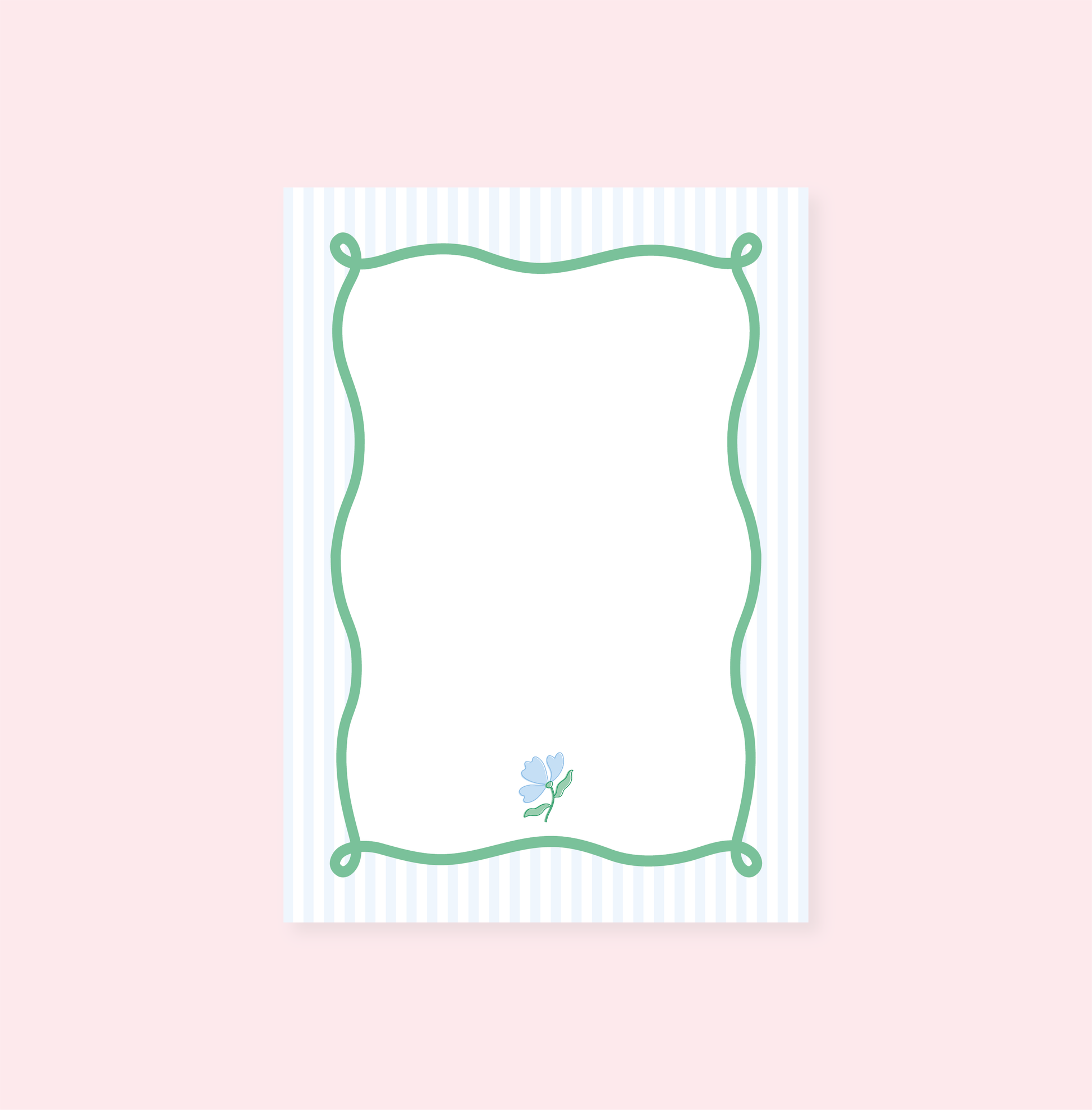 Add a dose of charm to your daily writing with our Striped Ribbon Bloom Notepad. Featuring soft blue vertical stripes, a playful green ribbon border, and a dainty blue flower at the bottom, this design strikes the perfect balance between whimsy and elegance. The spacious center is perfect for jotting down notes, to-do lists, reminders, or sweet messages.